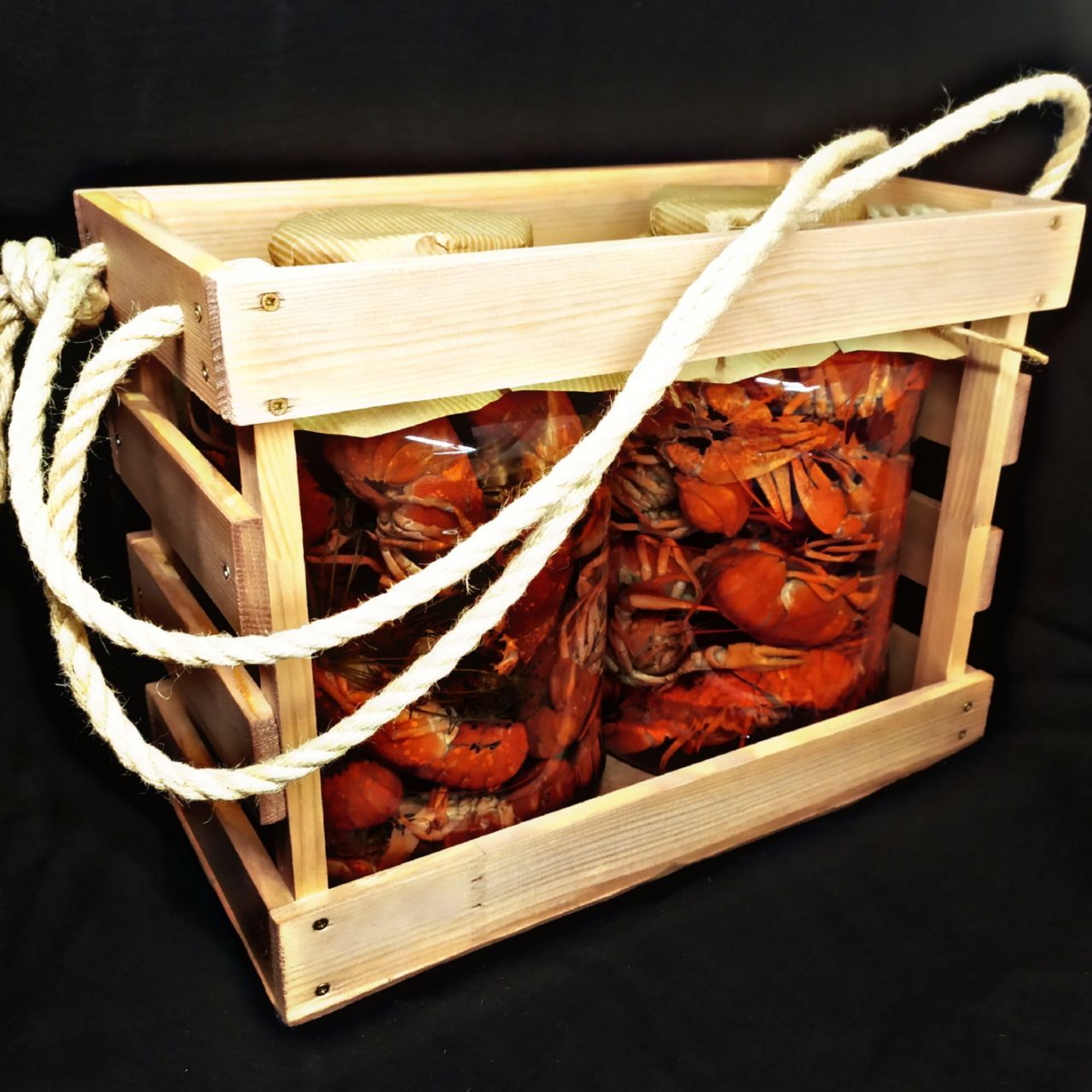 Состав: 3 кг горячих волжских раков крупного размера (L) в стеклянных банках объемом 3 л. Варка классическая, с сухим укропом, черным перцем и лавровым листом. Раки залиты горячим рассолом. Не консервированные. Упаковка - универсальный деревянный ящик ручной работы с веревочными ручками.